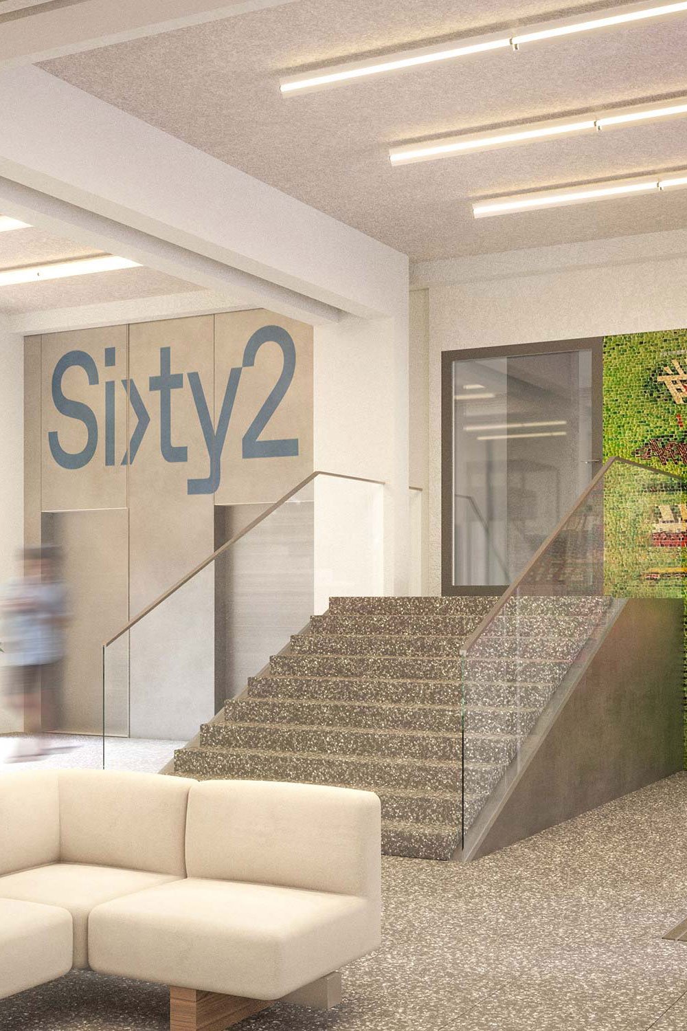 Sixty2 vereint Apartments, Coliving, Büros, ein Café und ein Fitnessstudio zu einem lebendigen Ort, der Aktivitäten und Gemeinschaft fördert.
